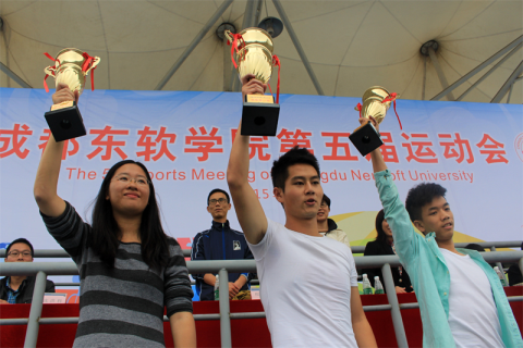仪式起始,由总裁判长古老师宣布了此次运动会比赛的成绩,其中13级数媒绳颖成获得男子200米冠军,15级数媒赵欣获得仰卧起坐亚军,数艺系教职工团队斩获龟兔赛跑冠军、拔河比赛季军。